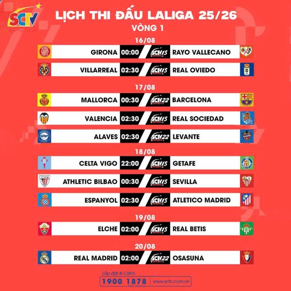 Hãy cùng chào đón sự trở lại của LALIGA EA SPORTS với vòng đấu đầu tiên hứa hẹn bùng nổ, nơi những trận cầu tâm điểm sẽ khiến mọi tín đồ túc cầu không thể rời mắt. Đừng bỏ lỡ 4 cuộc đối đầu nảy lửa: Mallorca – Barcelona; Real Madrid – Osasuna; Espanyol – Atletico Madrid; Girona – Rayo Vallecano. Tất cả sẽ được tường thuật trực tiếp trên kênh thể thao SCTV và ứng dụng SCTVOnline!