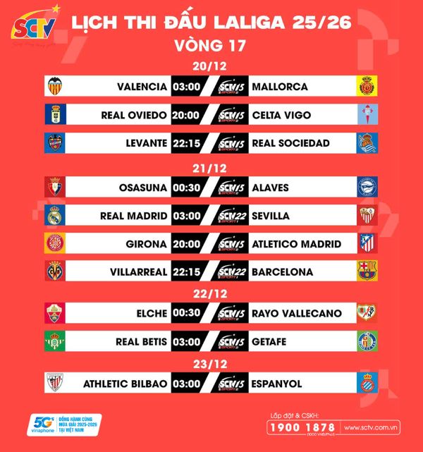 Vòng 17 LALIGA EA Sports 2025/26 là những trận cầu khép lại năm 2025 giữa Villarreal – Barcelona; Real Madrid – Sevilla; Girona – Atletico Madrid; và Athletic Bilbao – Espanyol. Tất cả được trực tiếp độc quyền trên SCTV và ứng dụng SCTVOnline!