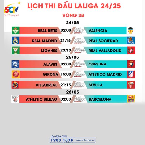 Bốn trận cầu tâm điểm vòng 38 LaLiga EA SPORTS: Athletic Bilbao vs Barcelona, Real Madrid vs Real Sociedad, Girona vs Atletico Madrid và Leganes vs Valladolid hứa hẹn bùng nổ cảm xúc với lễ chia tay, cuộc đua trụ hạng và màn tri ân CĐV. Tất cả sẽ được trực tiếp trên kênh thể thao SCTV và ứng dụng SCTVOnline!
